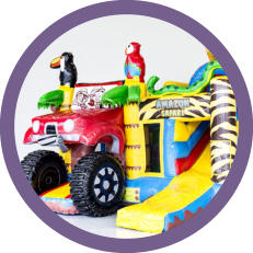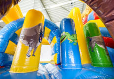 Die Hüpfburg Safari überzeugt auf jedenfall mit der farbenfrohen Optik der 3 D tiere beim Eingang sowie