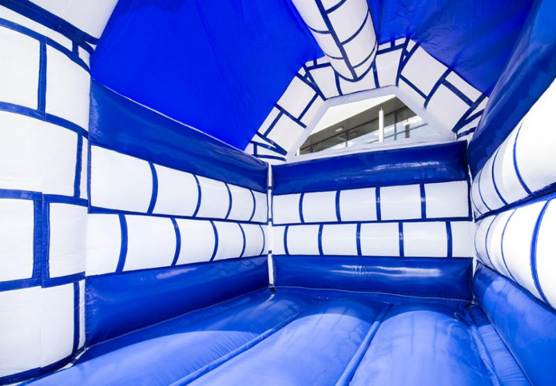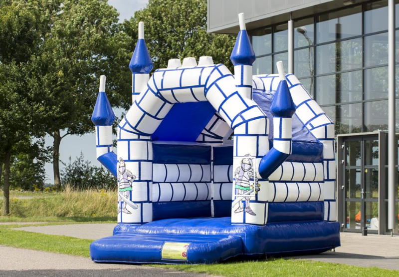 Hüpfburg ist in den Farben Blau/Weiß gehalten. Das Design wird durch die Abbildung zweier Ritter